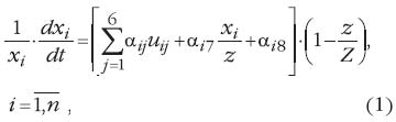 Квадратную скобку в уравнении можно интерпретировать как влияние каждого оператора на рынок. Таким образом, параметры αij , j=1,6 определяют степень влияния на рынок соответствующих управляющих воздействий, αi7 – влияние текущей доли рынка компании, αi8 – влияние прочих аспектов деятельности оператора, определяющих выбор абонента (реклама, качество управления и т.д.).