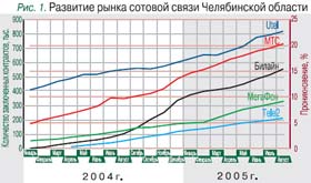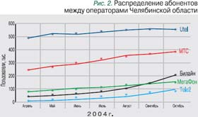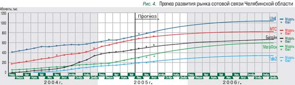 При моделировании развития произвольного регионального рынка сотовой связи с использованием системы уравнений (1) величина ошибок аппроксимации, шаг и точность прогнозирования определяются объемом и дискретностью исходной информации. В рассмотренном примере прогнозирования сотового рынка Челябинской области была использована ежемесячная статистика Ассоциации российских операторов стандарта GSM за период с января 2004 г. по август 2005 г. Прогнозирование развития операторов основывается на предположениях о возможных пределах изменений управляющих воздействий uij и тенденциях изменения параметров αij по реализовавшимся значениям.