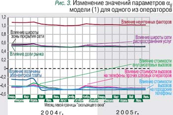 Влияние управляющих воздействий каждого оператора на местный рынок с начала 2005 г. стабилизировалось (рис. 3). Абсолютные значения параметров модели у всех перечисленных компаний близки, что обусловлено одинаковой реакцией потребителей на их управляющие воздействия.